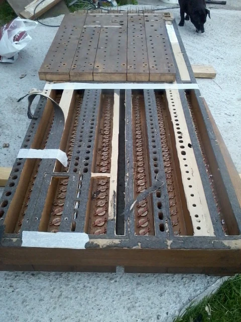 Before any of this could happen we had to replace the soundboard as was to new, as the air holes now needed to be accessed in a different way. For this, a frame was constructed to carry the whole lot, carefully dimensioned to allow access to every air hole: