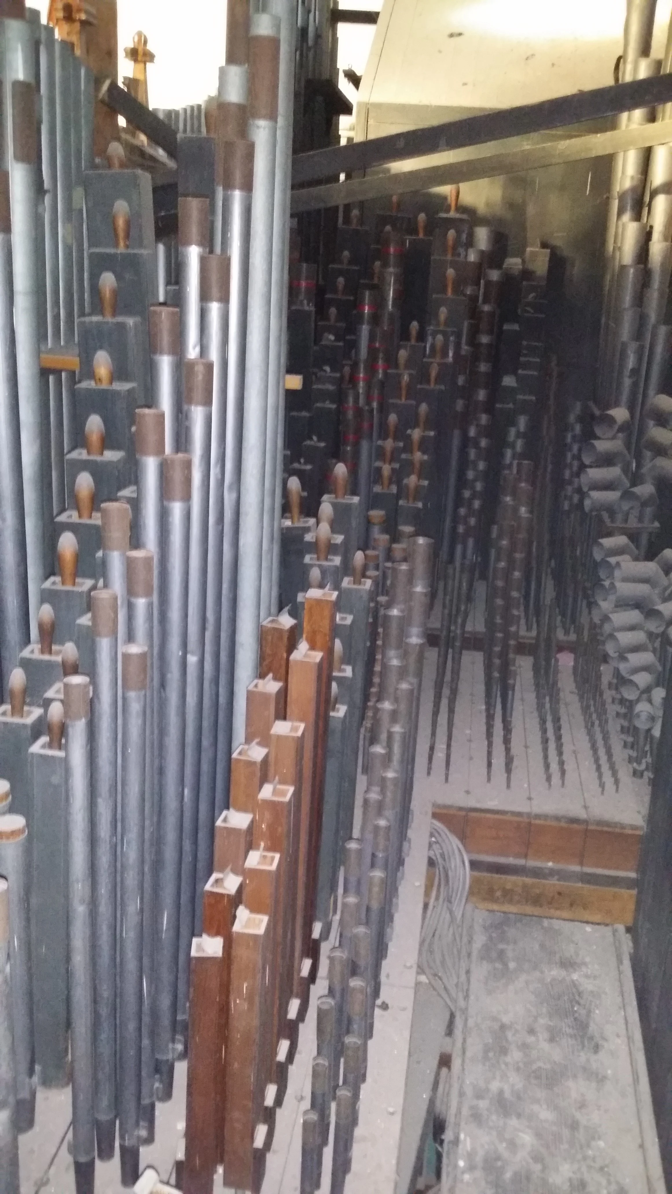 The inside of the upper organ, seen from the RH side. In the foreground is the Choir organ, then the Great, and then you can see the side of the Swellbox. It's a very wide organ.
